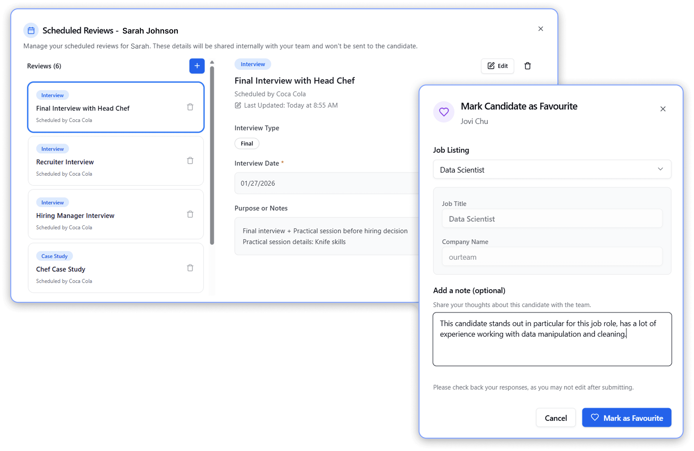 Review candidates together, leave feedback, track progress, and move candidates through your screening workflow with full visibility.