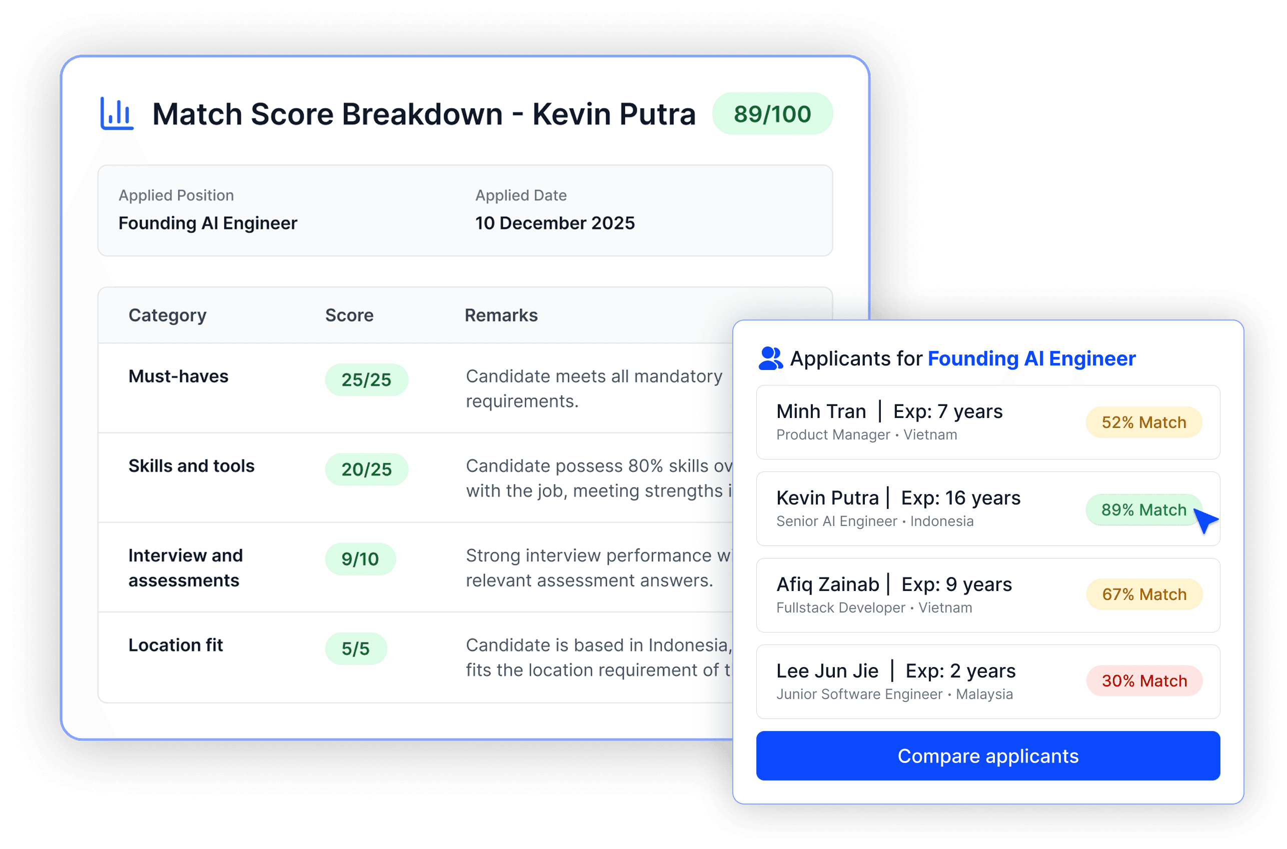 Automatically assess candidates using role-based AI interviews and score them against predefined competencies, skills, and experience.
